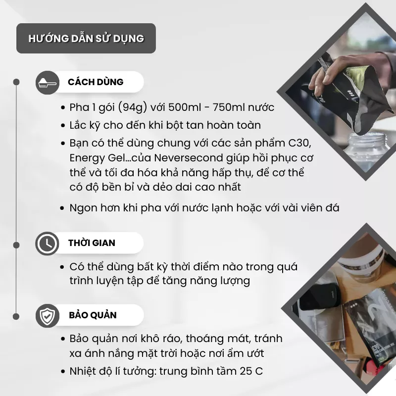 • Add 94g (1 Pack) C90 High Carb Drink Mix to 500ml or 750ml of water.