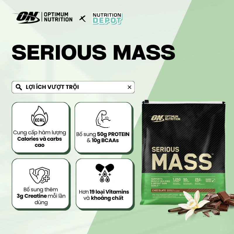 OPTIMUM NUTRITION Serious Mass powder helps fuel workouts with up to 1260 calories, 50g of protein, up to 253g of carbohydrates, and 3g of creatine monohydrate in every serving– all in a convenient shake for easy consumption.