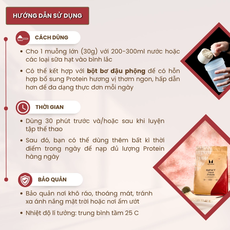 Add ¾ of large scoop (30g) to 250ml water or almond milk in Myprotein shaker, 30 minutes before and/or after your workout. Also, you can take at any time of the day to increase your daily protein intake.