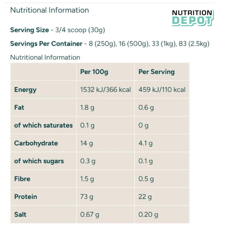 Unflavoured: Protein blend (100%) (Pea Protein Isolate,Fava Bean Isolate)