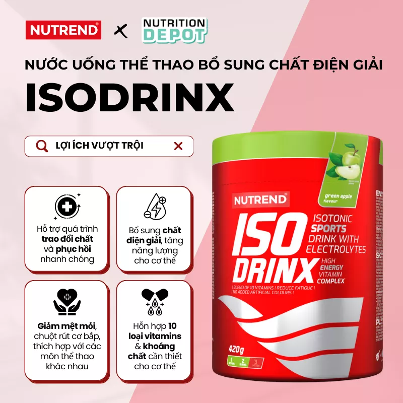 Isodrinx Nutrend là một loại đồ uống thể thao lý tưởng cho mọi hoạt động thể dục thể thao, đặc biệt là các hoạt động thể thao ngoài trời. Nhờ hàm lượng cao các loại carbohydrate được hấp thụ nhanh chóng, nó là nguồn năng lượng hoàn hảo và cung cấp cho cơ thể lượng khoáng chất phù hợp. Hơn nữa, sản phẩm bổ sung thêm 10 loại vitamins. Thức uống này sẽ giữ cho cơ thể bạn đủ nước trong khi hoạt động thể chất và giảm chuột rút cơ bắp. Việc uống đủ nước trong quá trình hoạt động thể chất cải thiện việc cân bằng các chất trong cơ thể, bổ sung lại các khoáng chất đã mất và phục hồi cơ thể.