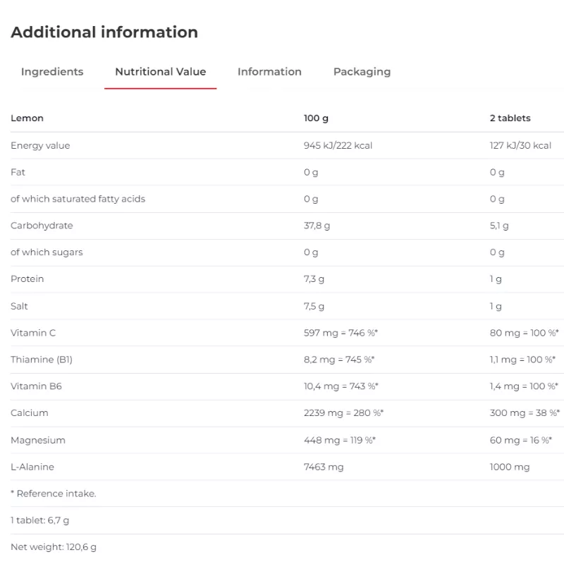 Vị táo xanh: Đường sucrose, đường glucose, maltodextrin, muối natri clorua, hỗn hợp vitamin (C, E, B3, B5, B6, B2, B1, B9, H, B12), chất điều chỉnh độ axit [INS330, INS331(iii), INS296, INS578, INS577], hương liệu tổng hợp, chất ổn định carrageenan INS407, chất chống đóng vón [INS341(iii), INS551, INS504(i)].