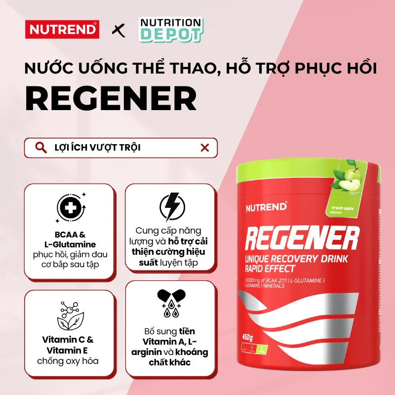 Thức uống phục hồi Nutrend REGENER là sự kết hợp hiệu quả giữa carbohydrate, khoáng chất (Mg, K, Na) và vitamin (C, E) góp phần bảo vệ tế bào cơ thể chống lại stress oxy hóa, giúp phục hồi hiệu quả sau khi tập luyện hoặc hoạt động cường độ cao. REGENER cũng chứa BCAA theo tỷ lệ 2:1:1, L-arginin, selen, Ginkgo biloba và tiền vitamin A. Bao bì tiện lợi giúp bạn dễ dàng mang REGENER bên mình khi tập luyện.