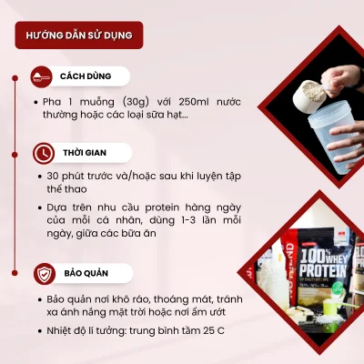 - Pha 1 muỗng lớn (30g) với 250 ml nước hoặc sữa vào bình lắc, dùng 30 phút trước và/hoặc sau khi luyện tập thể thao.