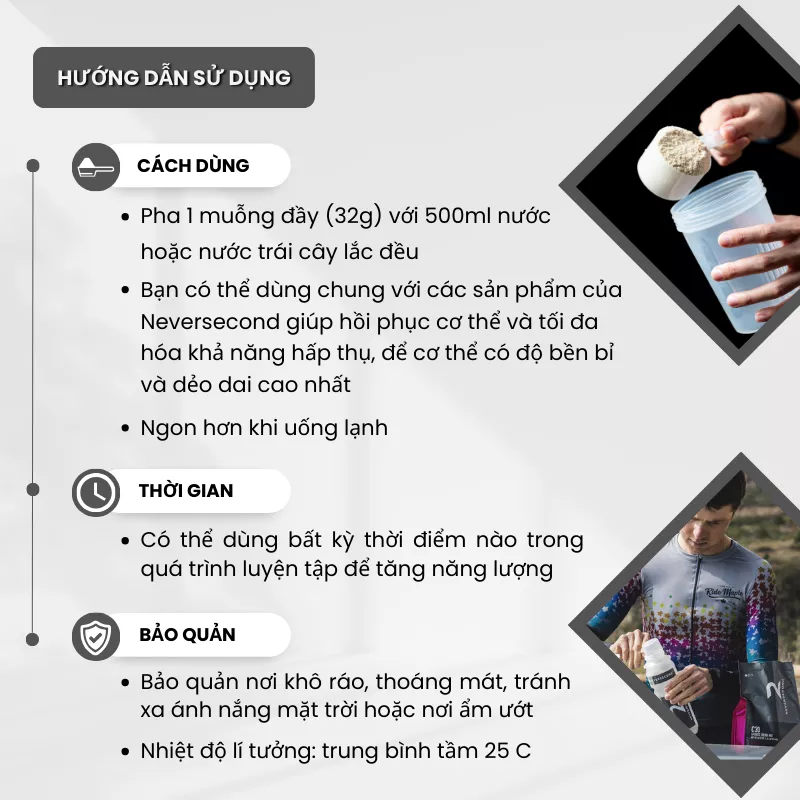 - Bạn có thể dùng chung với các sản phẩm của Neversecond giúp hồi phục cơ thể và tối đa hóa khả năng hấp thụ, để cơ thể có độ bền bỉ và dẻo dai cao nhất.