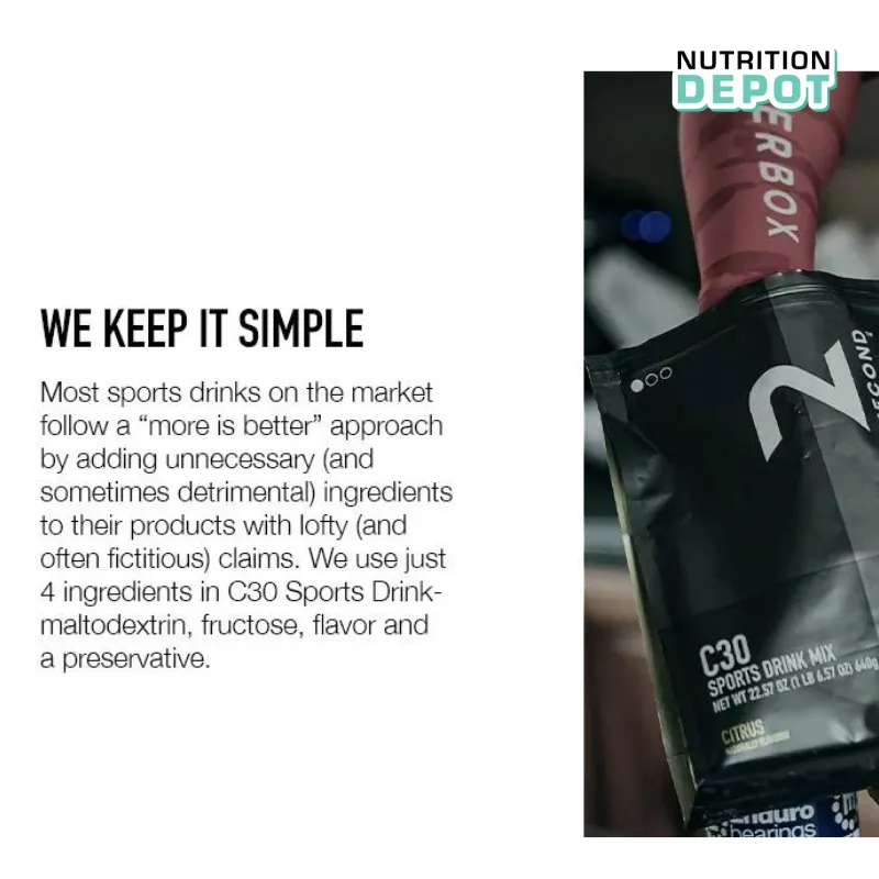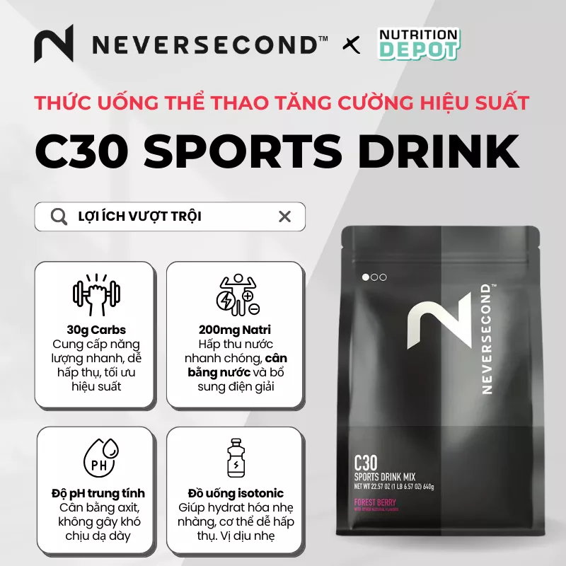 Một loại đồ uống thể thao đơn giản được tạo ra từ chỉ 4 nguyên liệu – maltodextrin, fructose, hương vị tự nhiên và natri. Thức uống thể thao C30 của Neversecond đã tái định nghĩa lại những gì mà một đồ uống thể thao nên có. Đó là một hỗn hợp thức uống dạng bột được công thức hóa với tỷ lệ 2:1 giữa Maltodextrin và Fructose, với hương vị nhẹ nhàng thanh mát và độ pH trung tính để giảm nguy cơ rối loạn dạ dày. C30 SPORT DRINK chỉ chứa những gì bạn cần, ở tỷ lệ chính xác, giúp bạn đạt hiệu suất tối ưu.