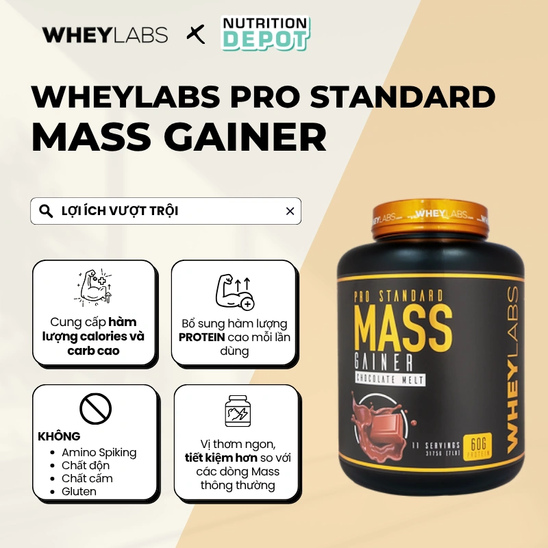 - Wheylabs Pro Standard Mass Gainer được thiết kế theo công thức dành cho người khó tăng cân, cung cấp nguồn calories khủng, cùng với lượng lớn carbohydrate, lần lượt 1127 calories, 216g carbohydrate lên đến 60g protein trong mỗi lần dùng